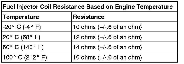 NOTE: The resistance of the circuit will vary according to the temperature of the injector coil. Use the table below to determine the resistance range of the injector.