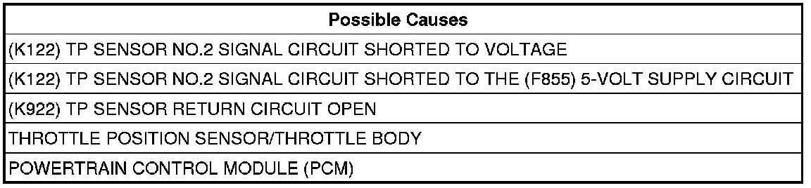 - Repair the short between the (K122) TP Sensor No.2 Signal circuit and the (F855) 5-volt Supply circuit.