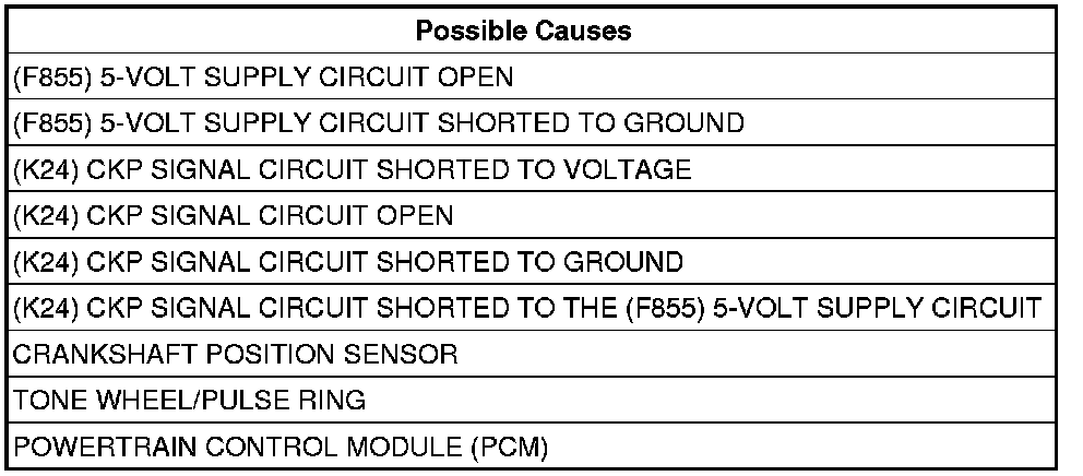- Repair the short between the (F855) 5-volt Supply circuit and the (K24) CKP Signal circuit.