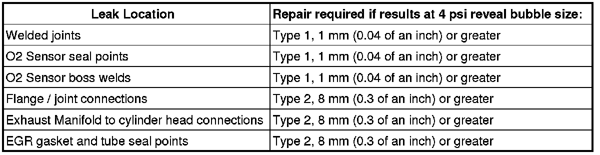 Any Type 1 or greater leaks found in welded joints, O2 sensor seal points or O2 sensor boss welds must be repaired or the component must be replaced.