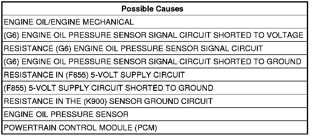 - Verify that there is good pin to terminal contact in the Sensor and Powertrain Control Module connectors. Remove the Engine Oil Pressure sensor and ensure the oil passage/port is free from any blockage. If OK, replace the Engine Oil Pressure Sensor.
