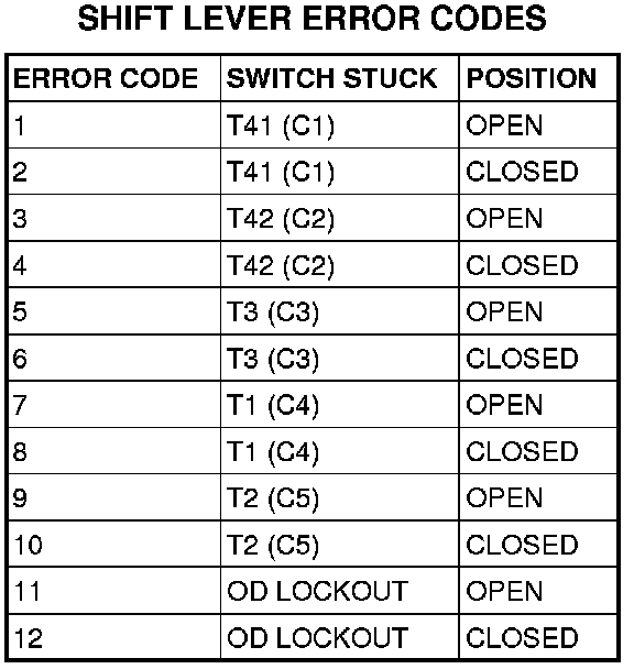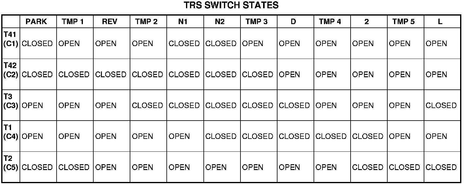 The T41 (C1) T42 (C2), T3 (C3), T1 (C4), or T2 (C5) Signal circuits communicate the shift lever position to the Transmission Control System. Each circuit is terminated at the transmission by a switch (TRS). Each switch can be either open or closed, depending on the shift lever position. The PCM can decode this information and determine the shift lever position.