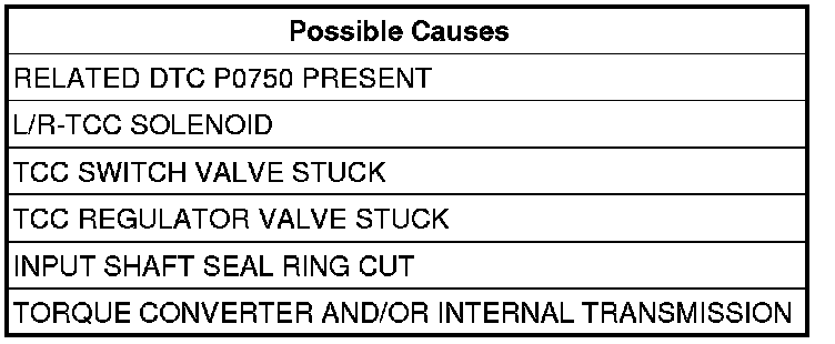 Transmission must be in EMCC, with input speed greater than 1750 rpm. L/R-TCC Solenoid achieves the maximum duty cycle and can not pull engine speed within 60 rpm of input speed. Also when the transmission is in FEMCC and the engine slips TCC more than 100 rpm for 10 seconds. This DTC can take up to five minutes of problem identification before illuminating the MIL.