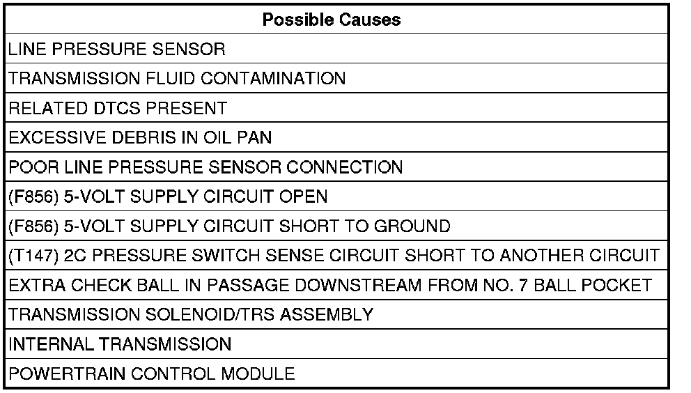If the Event Data shows the DTC P0845 set while the Line Pressure was significantly below the Desired Line Pressure reading, check for causes of low line pressure (low fluid level, broken or mis-installed primary oil filter or filter seal, sticking Main Regulator Valve in the Pump Valve Body etc.). If the data shows the DTC set while the Line Pressure reading was significantly higher than the Desired Line Pressure, check the Line Pressure Sensor and related wiring.