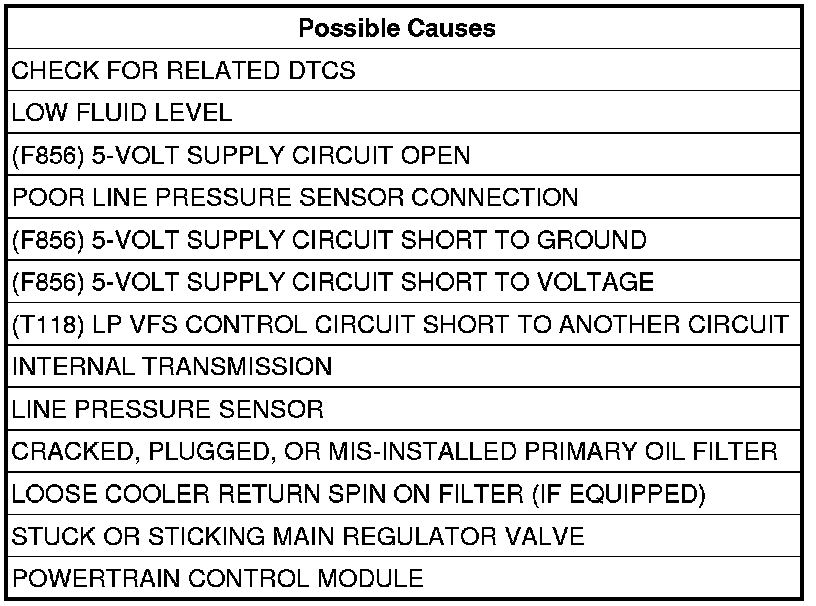 The PCM continuously monitors Actual Line Pressure and compares it to Desired Line Pressure. If the Actual Line Pressure is more than 15 psi below Desired Line Pressure for 3.5 seconds continuously, this DTC will set.