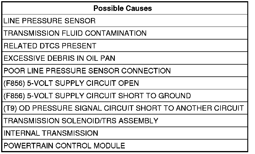 If the Event Data shows the DTC P0870 set while the Line Pressure was significantly below the Desired Line Pressure reading, check for causes of low line pressure (low fluid level, broken or mis-installed primary oil filter or filter seal, sticking Main Regulator Valve in the Pump Valve Body etc.). If the data shows the DTC set while the Line Pressure reading was significantly higher than the Desired Line Pressure, check the Line Pressure Sensor and related wiring.