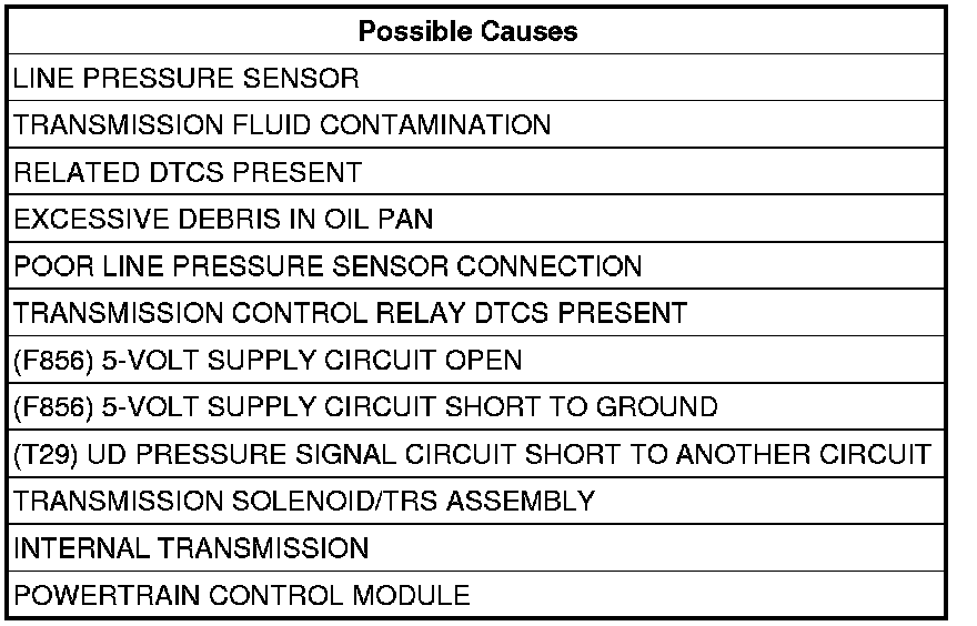 If the Event Data shows the DTC P0875 set while the Line Pressure was significantly below the Desired Line Pressure reading, check for causes of low line pressure (low fluid level, broken or mis-installed primary oil filter or filter seal, sticking Main Regulator Valve in the Pump Valve Body etc.). If the data shows the DTC set while the Line Pressure reading was significantly higher than the Desired Line Pressure, check the Line Pressure Sensor and related wiring.