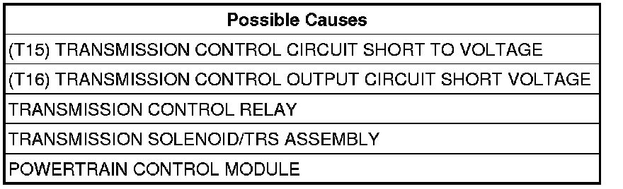 - Repair the (T16) Transmission Control Output circuit for a short to voltage.