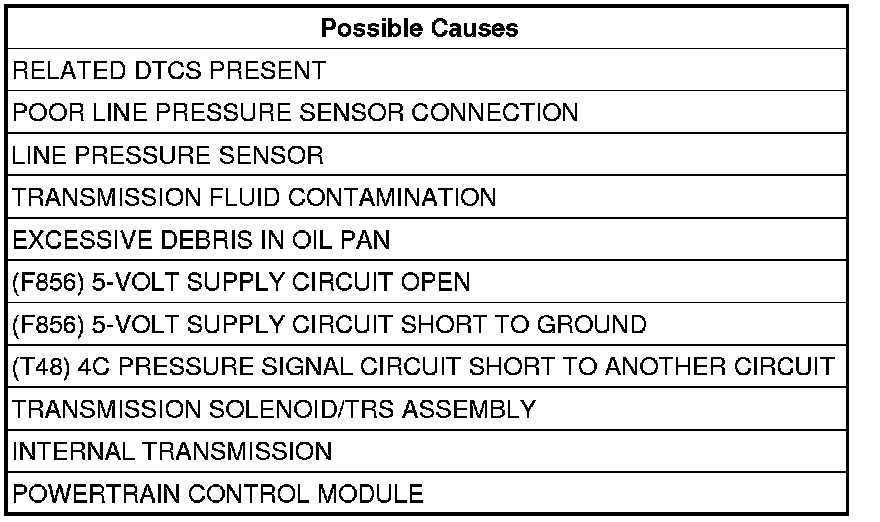 If the Event Data shows the DTC P0987 set while the Line Pressure was significantly below the Desired Line Pressure reading, check for causes of low line pressure (low fluid level, broken or mis-installed primary oil filter or filter seal, sticking Main Regulator Valve in the Pump Valve Body etc.). If the data shows the DTC set while the Line Pressure reading was significantly higher than the Desired Line Pressure, check the Line Pressure Sensor and related wiring.