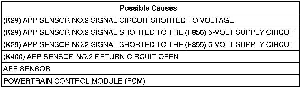 - Repair the short between the (K29) APP Sensor No.2 Signal circuit and the (F856) 5-volt Supply circuit.