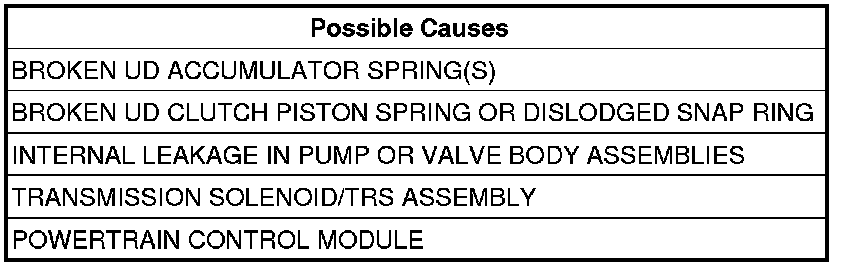 - Repair internal transmission. Pay attention to components related to the UD clutch. Broken or weak return spring or a dislocated snap ring. If no trouble is found in UD clutch component or UD clutch leakage was noted in passage, replace the Pump Assembly.