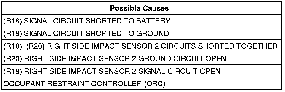 - Repair the (R18), (R20) Right Side Impact Sensor 2 circuits shorted together.