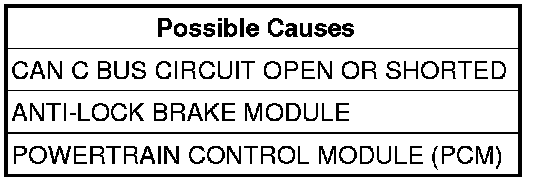 The PCM doesn't receive a vehicle speed signal from the Anti-lock brake Module over the CAN C bus. One Trip fault.