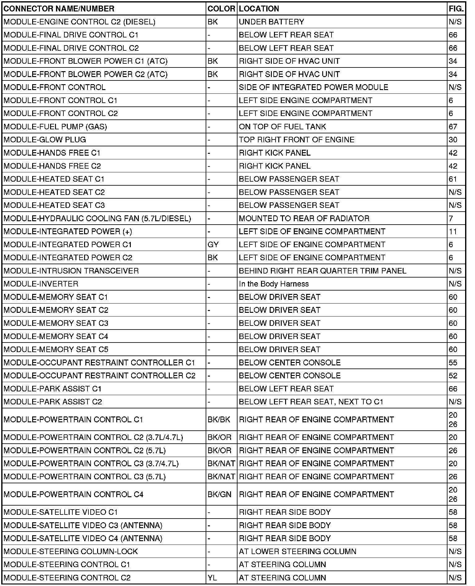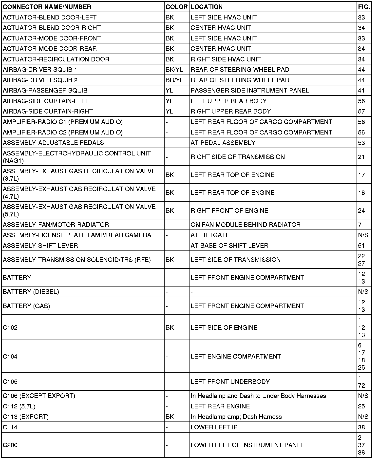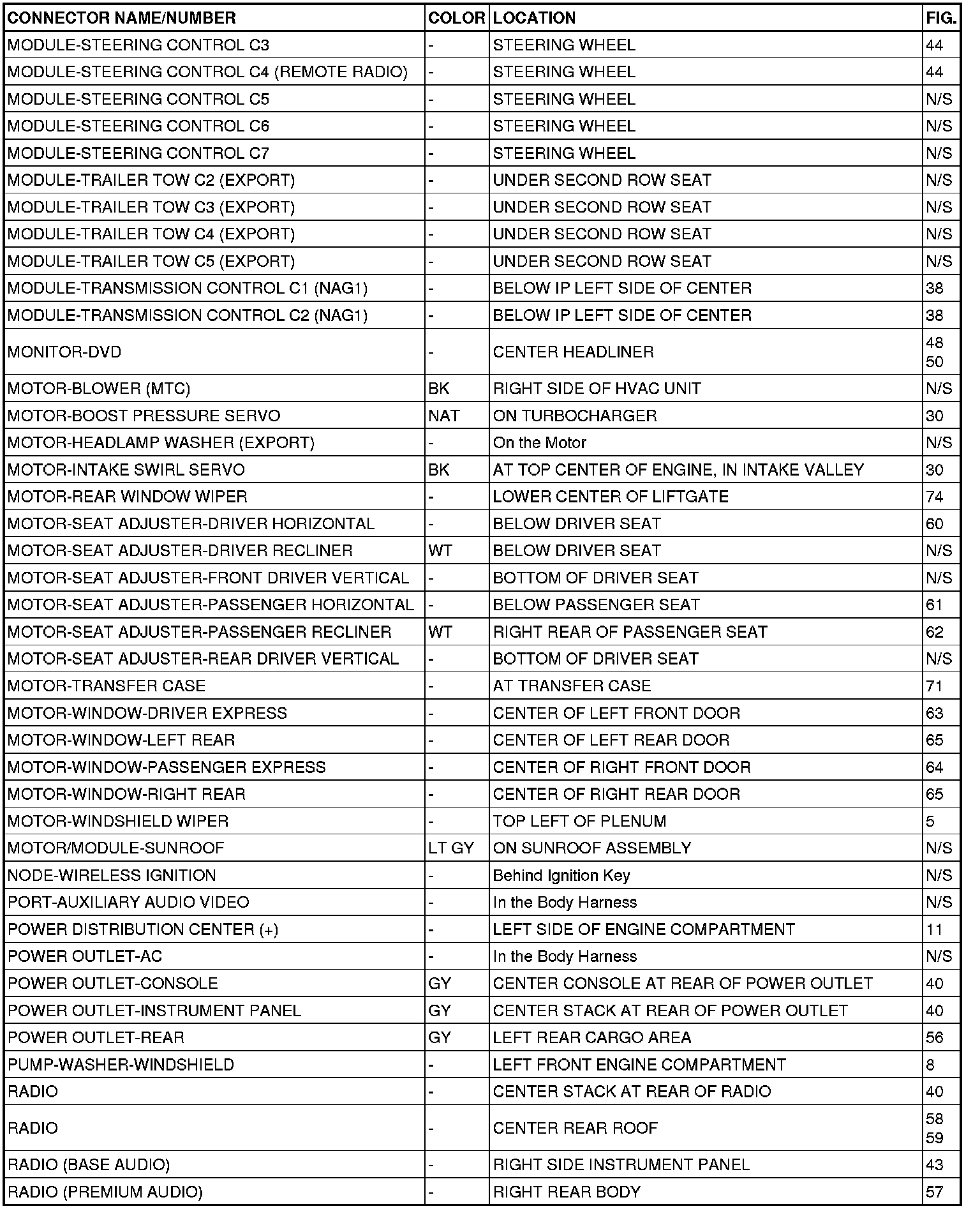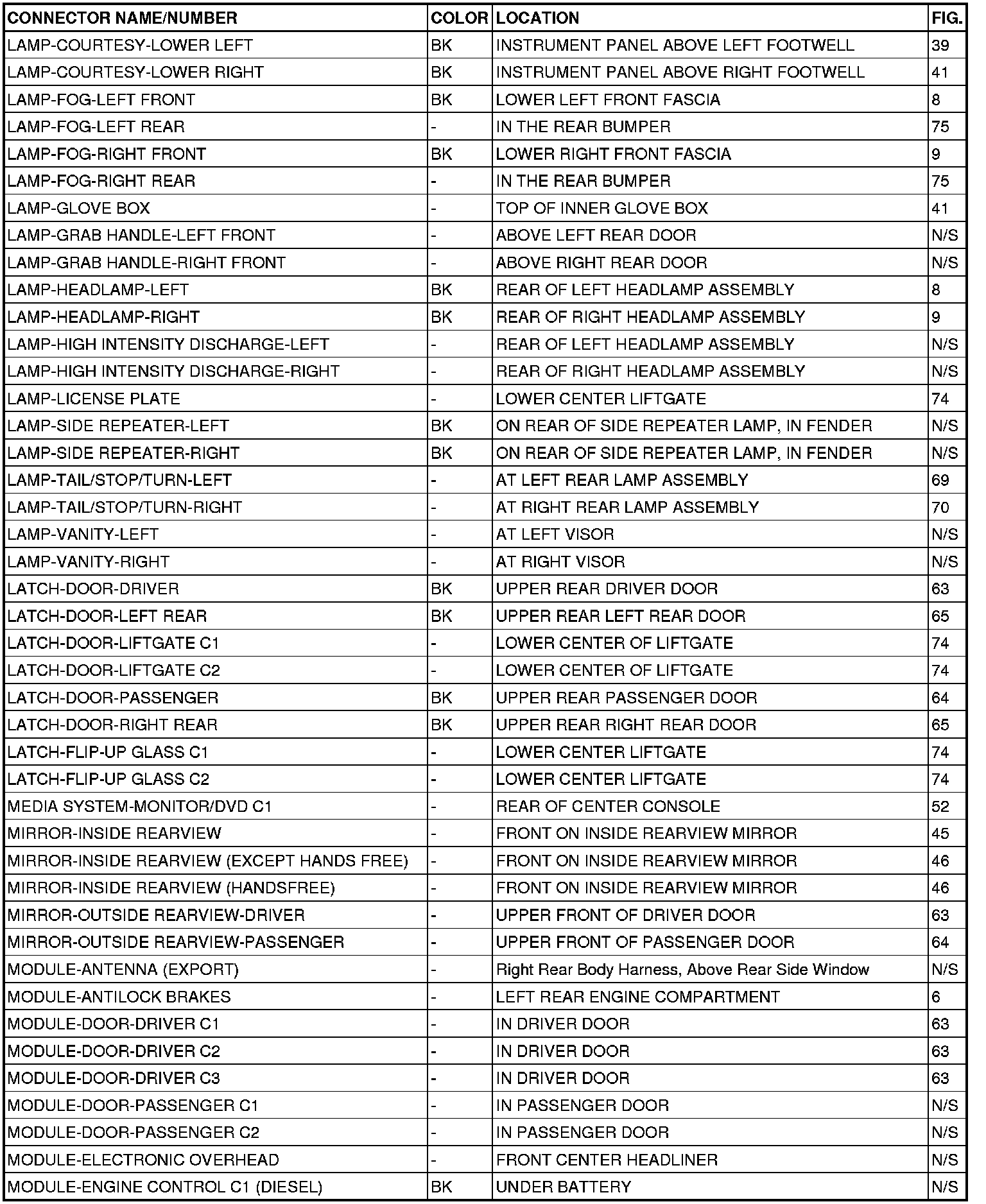 This section provides illustrations identifying connector, ground and splice locations in the vehicle. Connector, ground and splice indexes are provided. Use the wiring diagrams in each section for connector, ground and splice identification. Refer to the appropriate index for the proper figure number. For items that are not shown in this section N/S is placed in the Fig. column.