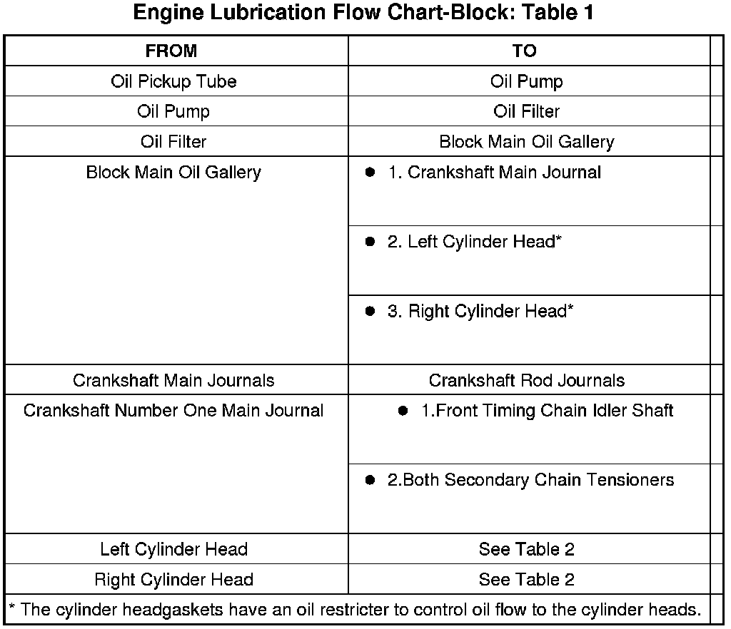 The camshaft exhaust valve lobes and rocker arms are lubricated through a small hole in the rocker arm; oil flows through the lash adjuster then through the rocker arm and onto the camshaft lobe. Due to the orientation of the rocker arm, the camshaft intake lobes are not lubed in the same manner as the exhaust lobes. The intake lobes are lubed through internal passages in the camshaft. Oil flows through a bore in the number 3 camshaft bearing bore, and as the camshaft turns, a hole in the camshaft aligns with the hole in the camshaft bore allowing engine oil to enter the camshaft tube. The oil then exits through 1.6mm (0.063 in.) holes drilled into the intake lobes, lubricating the lobes and the rocker arms.