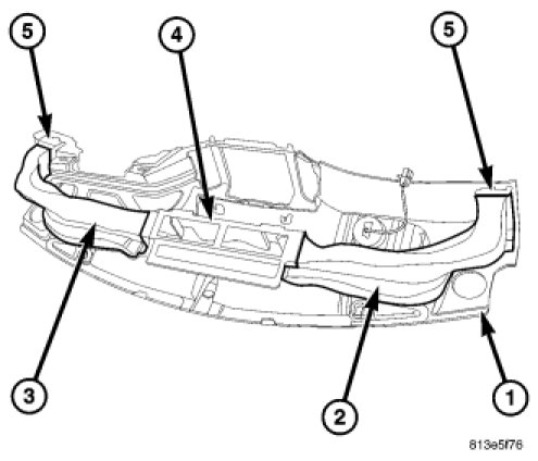 2. Connect the instrument panel ducts to the air outlets (5) and the main distribution duct (4). Make sure that the ducts are correctly installed over the instrument panel and demister outlet seals.