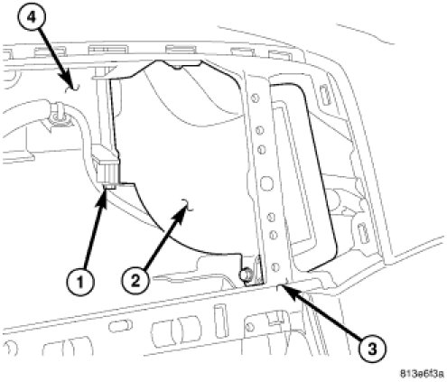 6. Position the center instrument panel duct(s) (2) into the instrument panel (3) through the opening for the radio.