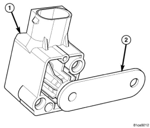 Two axle sensors (1) are used on vehicles equipped with the optional High Intensity Discharge (HID) headlamps, one each for the front and rear axles of the vehicle. The front and rear sensors are identical, but are secured by screws to a unique fixed bracket that is mounted to a frame member below the right front suspension upper control arm or above the right side of the rear axle below the upper control arm. The sensor has a mechanical lever arm (2) that rotates a sensor input shaft. The opposite end of the lever arm is secured by a nut to a ball stud on a unique linkage that is articulated by the changing positions of the right front or right rear suspension members in relationship to the body of the vehicle.