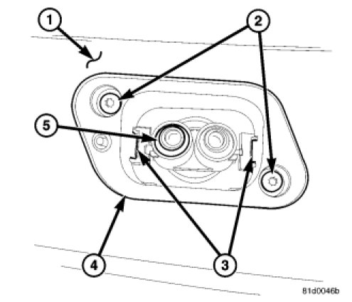 1. Reach up behind the front fascia to access the washer nozzle supply hose (1) quick connect fitting (4) and seat the molded plastic lock (2) onto the fitting.