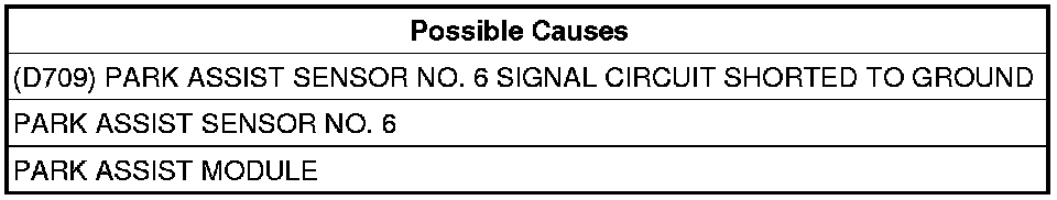- Repair the (D709) Park Assist Sensor No. 6 Signal circuit for a short to ground.