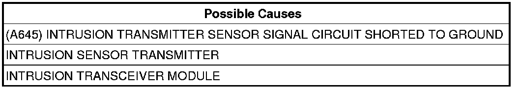 - Repair the (A645) Intrusion Transmitter Sensor Signal circuit for a short to ground.