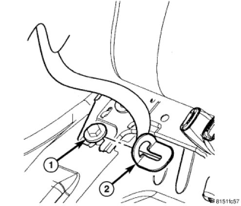 3. Slide the two outboard seat belt anchors (2) onto the outboard lower bolts (1). Tighten bolts to 50 Nm (37 ft. lbs.).