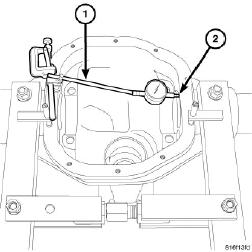 2. Install Pin C-3288-B on left side of the differential housing and attach Dial Indicator C-3339 (1) to the pilot stud. Load the indicator plunger (2) against the opposite side of the housing and zero dial indicator.