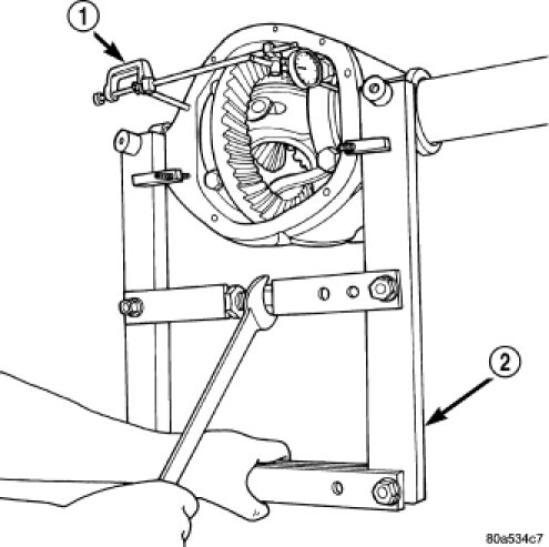 7. Spread housing with the spreader (2) to a maximum of 0.50 mm (0.020 in). Measure the distance with the dial indicator (1).