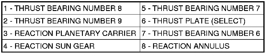 30. Install the number 6 thrust bearing (7) against the output shaft selective thrust plate (6) with the flat side against the thrust plate and the raised tabs on the inner race facing the front of the transmission.