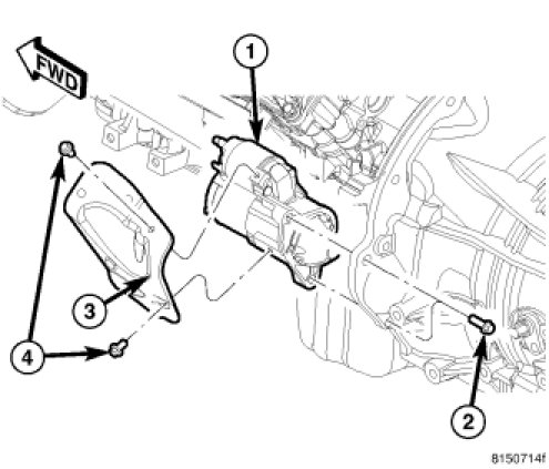 20. Disconnect the starter wires. Remove starter motor (1) Starter Motor - Removal
