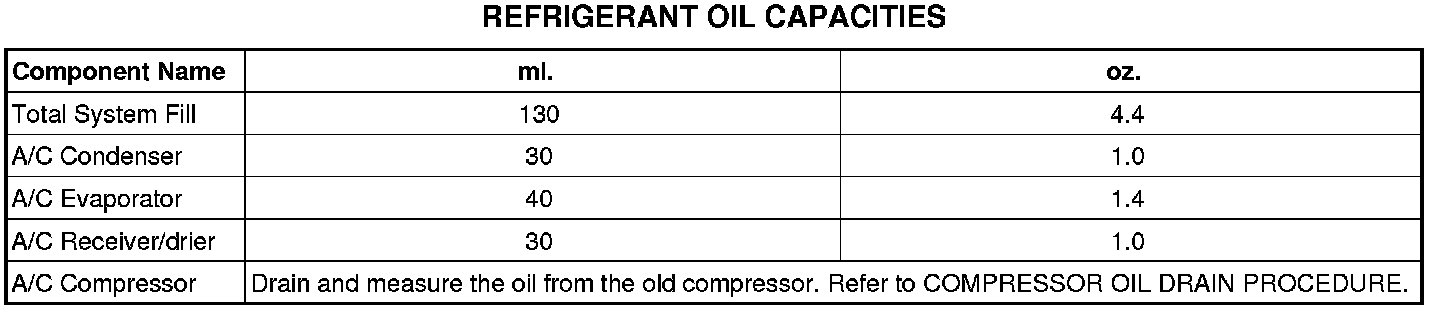 Refrigerant oil must be added when an A/C condenser, A/C evaporator or A/C receiver/drier is replaced. See the Refrigerant Oil Capacities chart.