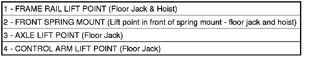When properly positioned, a floor jack can be used to lift the vehicle (3 and 4). Support the vehicle in the raised position with jack stands at the front and rear ends of the frame rails (1 and 2).