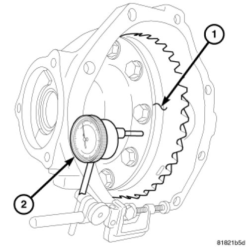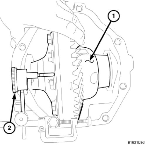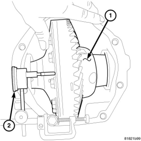 15. Push and hold differential case (1) to the ring gear side of the housing, and record ring gear dial indicator (2) reading.