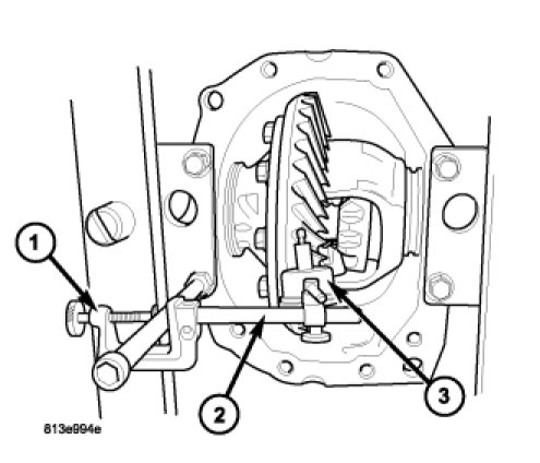 2. Set up Dial Indicator Set C-3339-A with Clamp SP-5426 (1), Post SP-5425-B (2) and Metric Dial Indicator 9524 (3) to measure ring gear backlash: