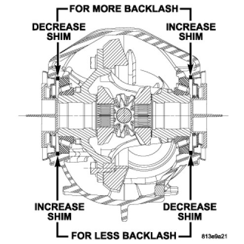 4. If backlash measurement is less than 0.13 mm (0.005 in), it is necessary to decrease the snap ring thickness on the ring gear side, and increase the thickness on the pinion side equal amounts.
