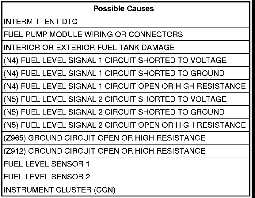 - Repair the (N5) Fuel Level Signal 2 circuit for an open circuit or high resistance.