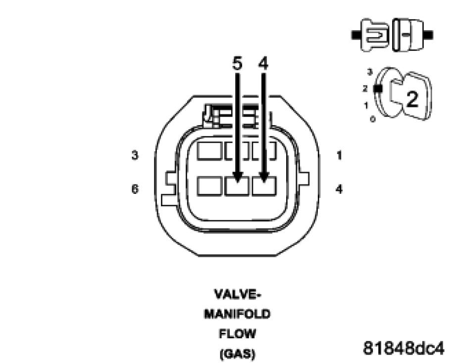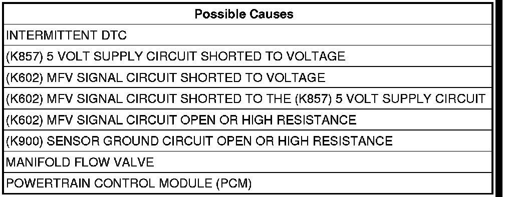 Measure the resistance between the (K602) MFV Signal circuit and the (K857) 5 Volt Supply in the Manifold Flow Valve harness connector.