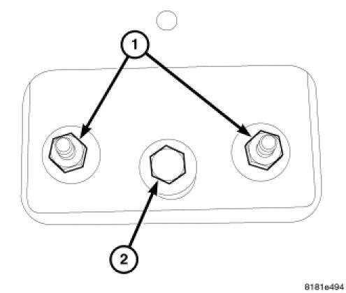 2. Carefully, pry down headliner and install the nuts (1) and bolt (2).