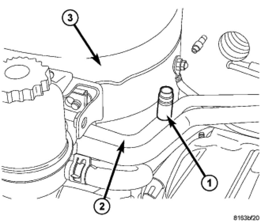 The high side service port (1) is located on the A/C discharge line (2) in front of the engine, below the upper radiator hose (3).