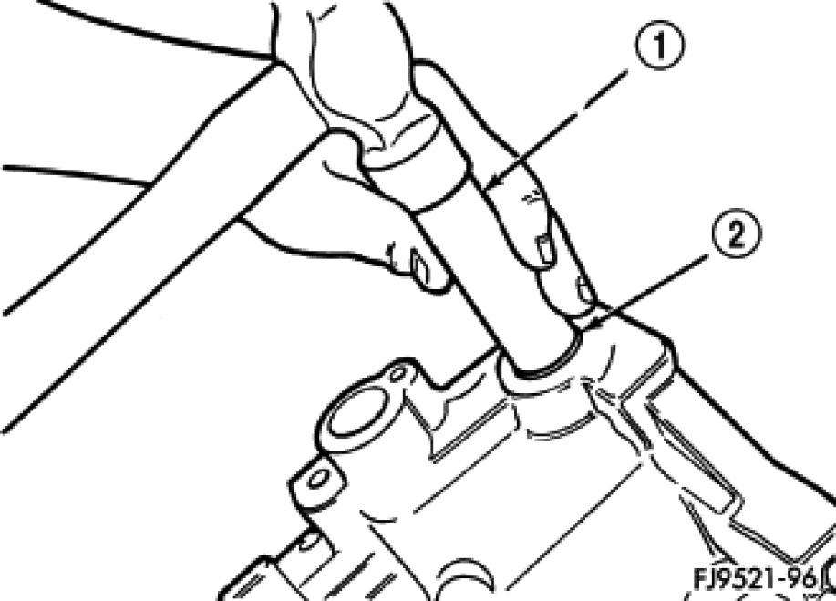 Using an appropriate size deep-well socket (1), install bushing (2) in selector shaft bore.