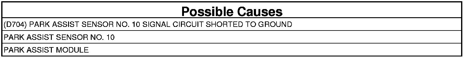 - Repair the (D704) Park Assist Sensor No. 10 Signal circuit for a short to ground.