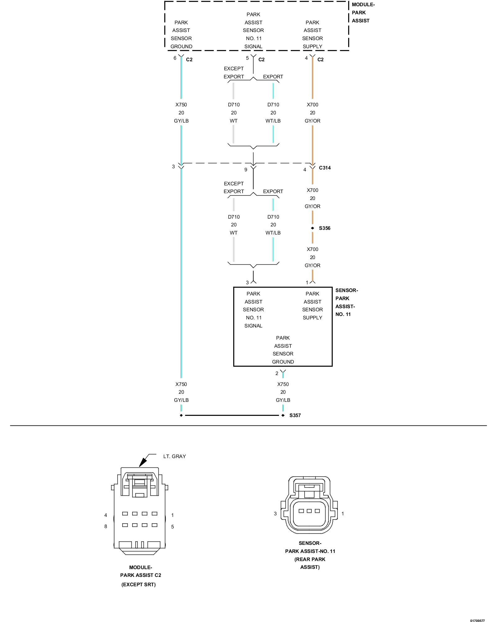 2. Using a 12-volt test light connected to ground check the (D710) Park Assist Sensor No. 11 Signal circuit at the Park Assist module C2 harness connector for a short to battery.