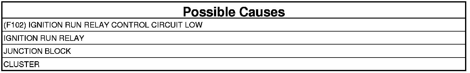 When the Cluster senses a low condition on the (F102) Ignition Run Relay Control circuit for over 10 seconds, this code will set.