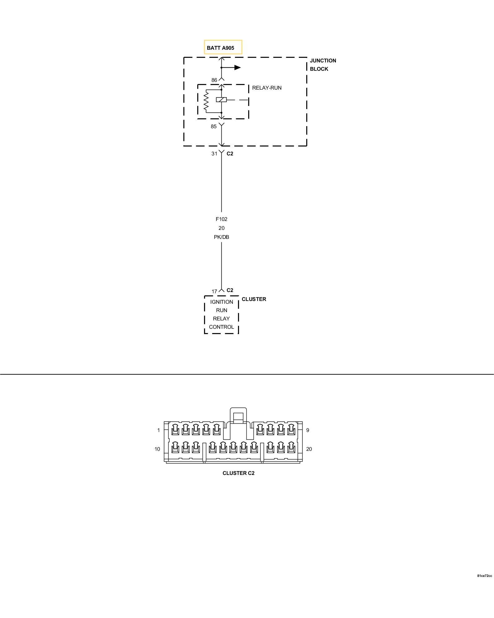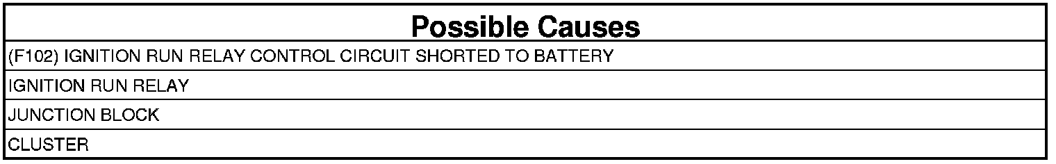 When the Cluster senses a high condition on the (F102) Ignition Run Relay Control circuit for over 10 seconds, this code will set.