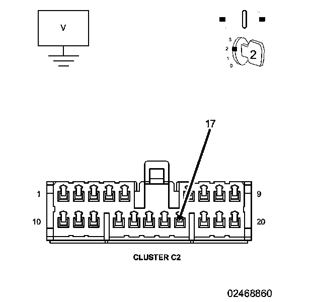 3. Measure the voltage between ground and the (F102) Ignition Run Relay Control circuit in the Cluster C2 connector.