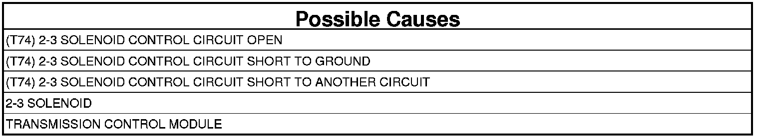 - Repair the (T74) 2-3 Solenoid Control circuit for a short to ground.
