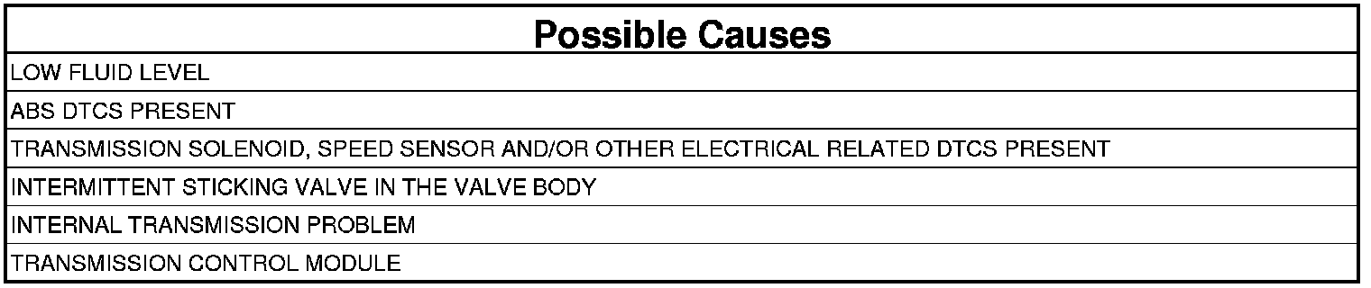 4. This DTC is usually set due to an internal transmission problem such as but not limited to: stuck solenoid valve and/or contamination in the valve body, broken springs, leaking clutch seals, dislodged or broken snap ring etc.