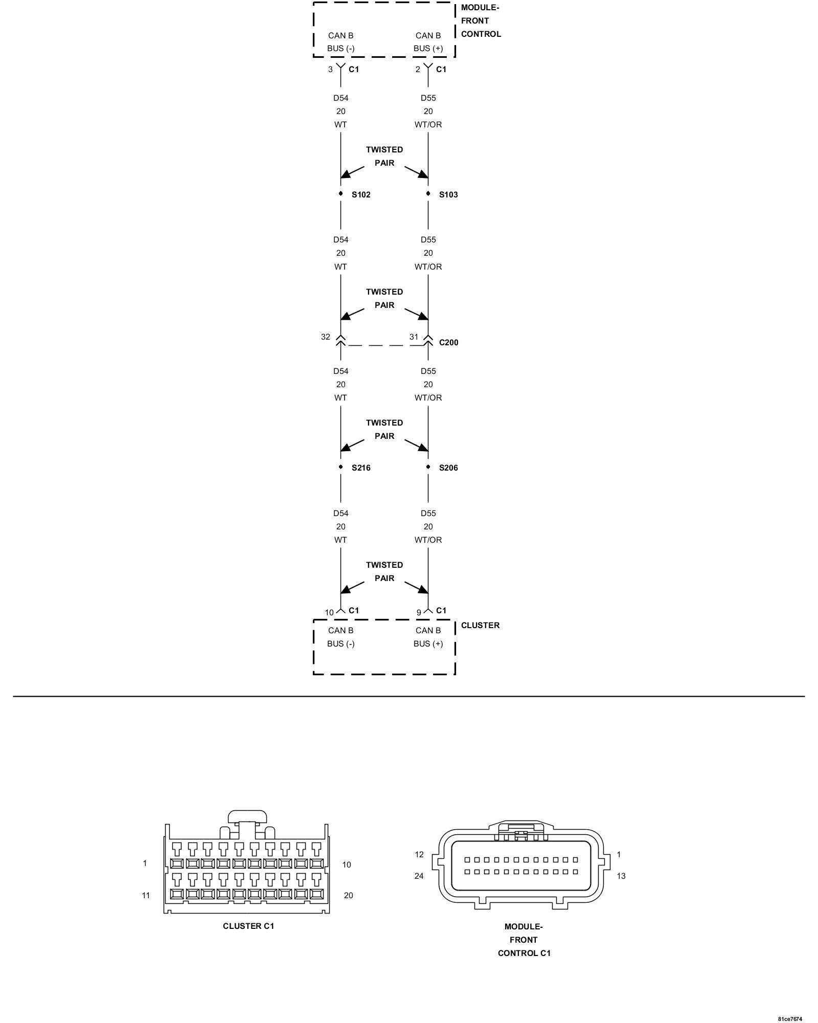 1. Measure the resistance of the (D54) Can B Bus (-) circuit between the Front Control Module C1 harness connector and the Instrument Cluster C3 harness connector.