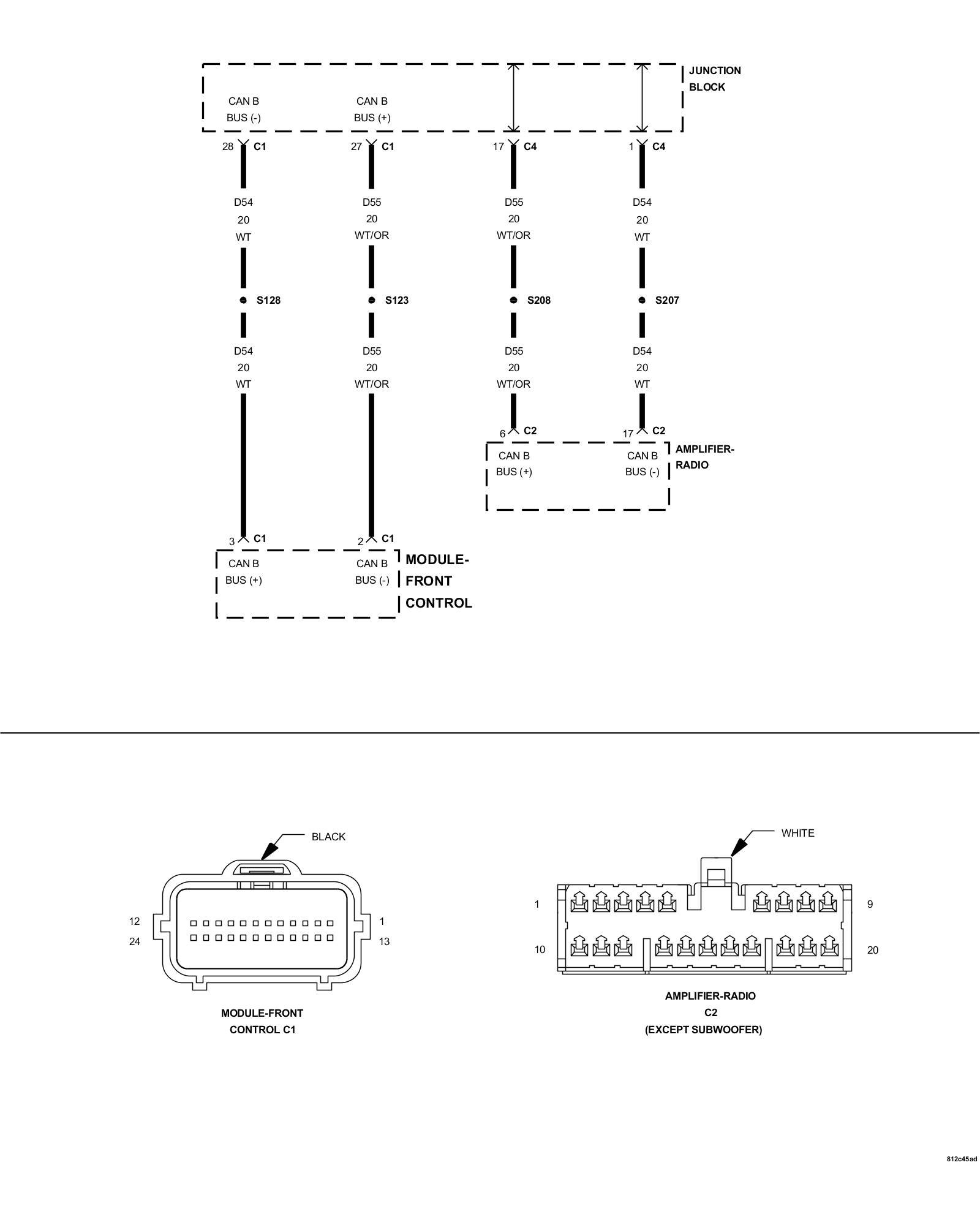 1. Measure the resistance of the (D54) Can B Bus (-) circuit between the Front Control Module C1 harness connector and the Amplifier C2 harness connector.