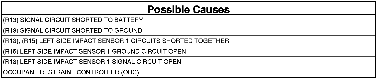 - Repair the (R13) Left Side Impact Sensor 1 Signal circuit for an open or high resistance.